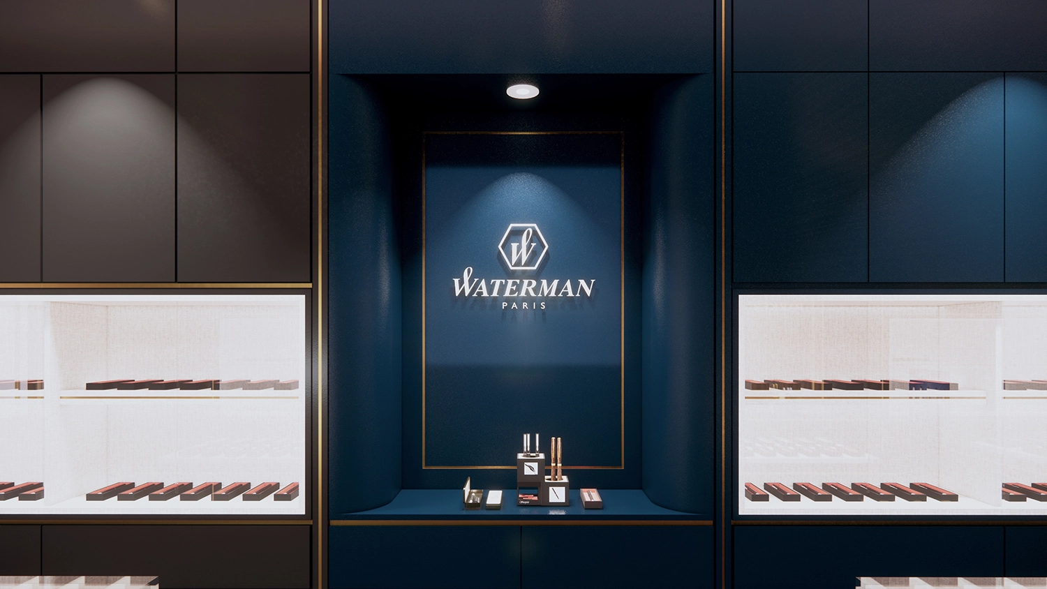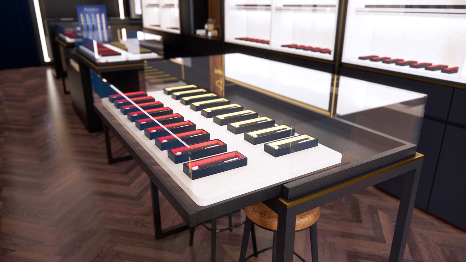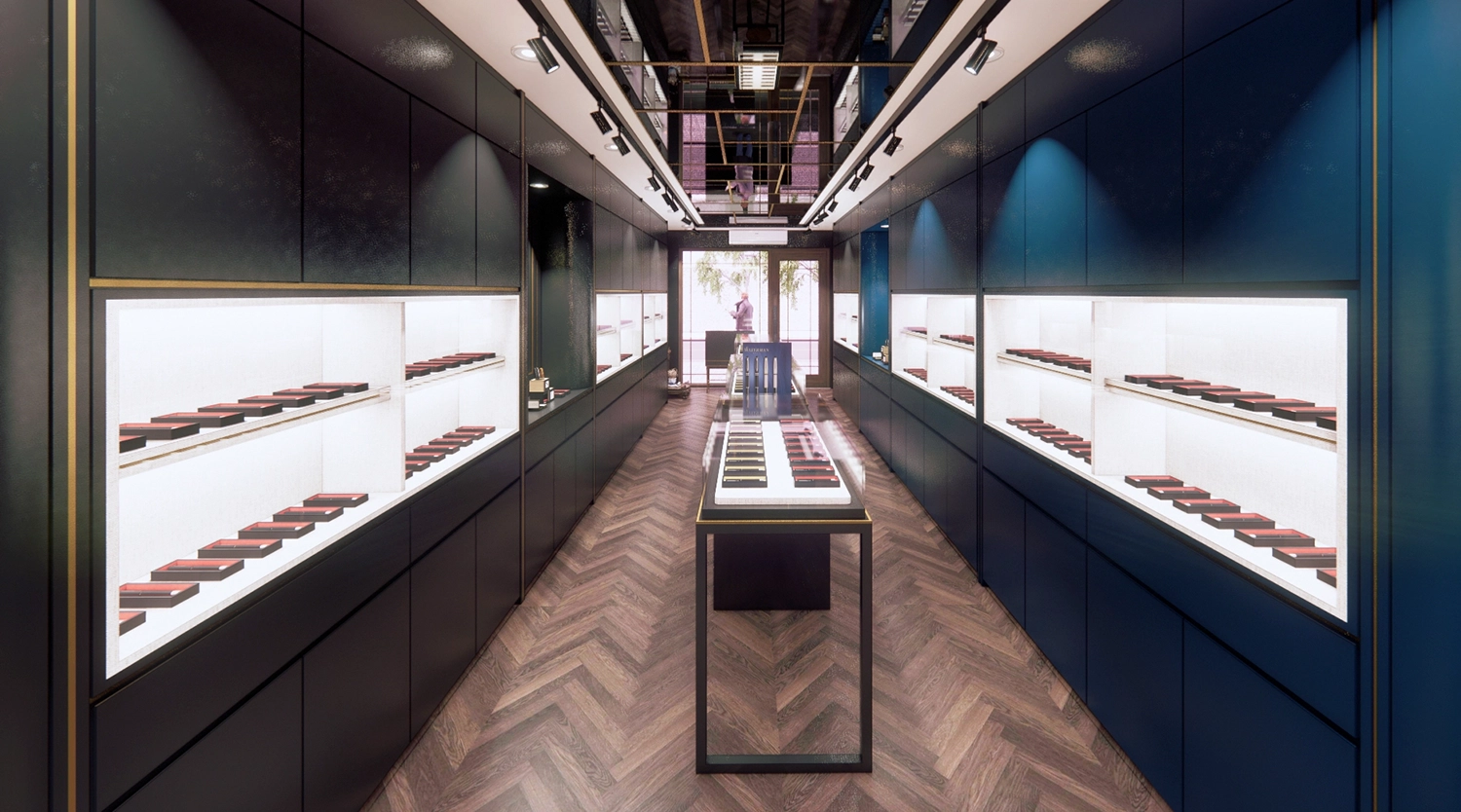 Nội thất sử dụng các vật liệu cao cấp như gỗ, kính và kim loại, kết hợp với tông màu trung tính và điểm nhấn màu sắc, tạo nên một không gian trang nhã và lịch lãm. Bố trí cửa hàng được sắp xếp hợp lý, tạo luồng di chuyển thoải mái và thu hút sự chú ý đến từng sản phẩm trưng bày. Hệ thống ánh sáng được thiết kế kỹ lưỡng để làm nổi bật các sản phẩm, đồng thời mang lại bầu không khí ấm áp và chào đón cho khách hàng. Tất cả các yếu tố đều được chăm chút tỉ mỉ để mang đến một trải nghiệm mua sắm cao cấp và đáng nhớ.