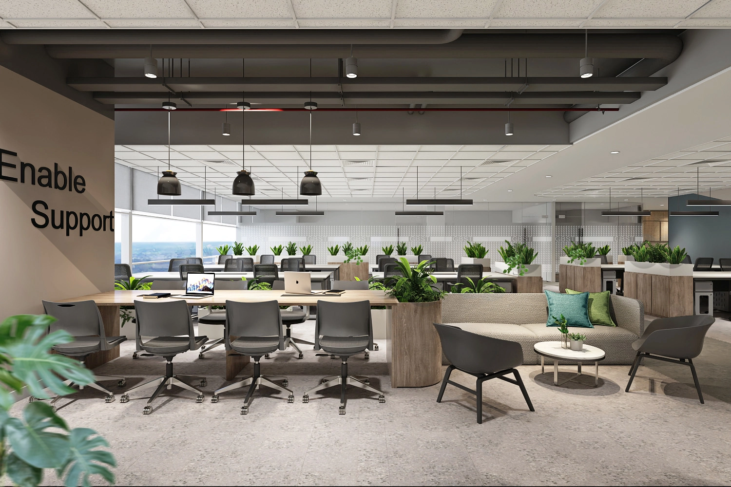 Các vật liệu và nội thất được chọn lọc kỹ lưỡng, mang đến sự hài hòa giữa công năng và thẩm mỹ. Màu sắc chủ đạo là những tông màu nhẹ nhàng và tinh tế, giúp tạo cảm giác thoải mái và chuyên nghiệp. Hệ thống ánh sáng và điều hòa không khí được thiết kế khoa học, đảm bảo mang lại môi trường làm việc tốt nhất cho toàn bộ nhân viên.